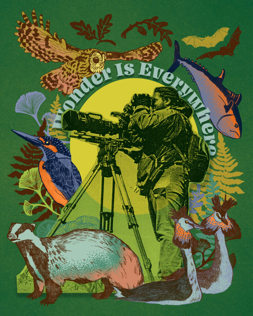 Illustration inspired by the BBC wildlife documentary series Hamza’s Hidden Wild Isles, presented and filmed by Hamza Yassin. Season by season, each programme uncovers the amazing array of wildlife that we have at home across the UK. I created the illustration around the central theme of the series: ‘Wonder is everywhere – if you know where to look’. Watching the pure joy and excitement that Hamza experiences while out on his wildlife spotting trips, whether it be in the Scottish Highlands or in the heart of the city, inspired me to capture this delight through illustration. Using collage and hand-drawn elements, my illustration captures some stand out moments from the series: Hamza spotting a kingfisher for the first time, Atlantic Bluefin tuna hunting off the UK coastline and a pair of great crested grebes dancing in Cardiff docks.