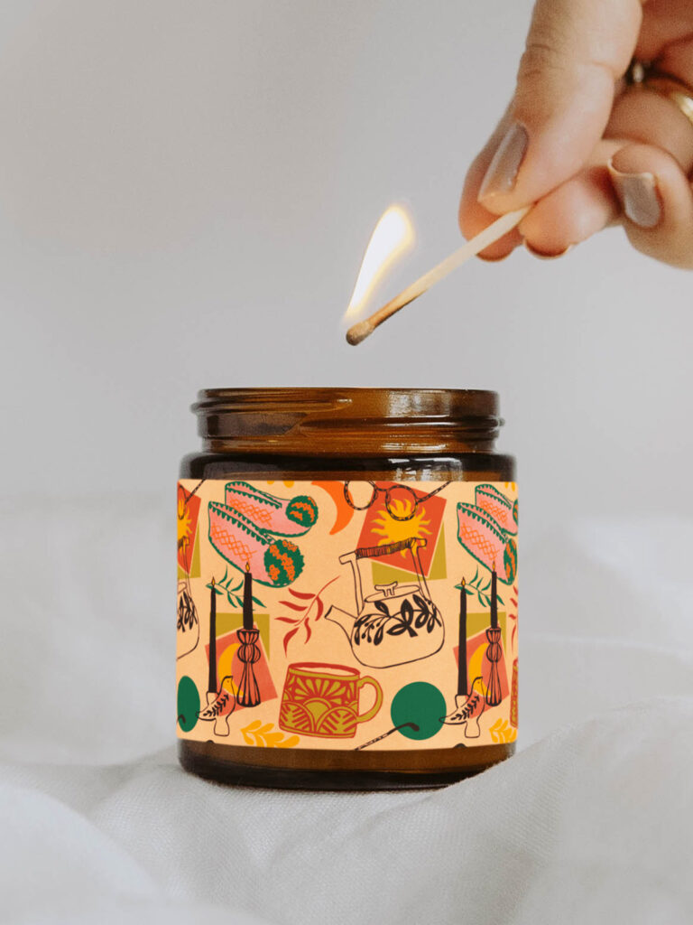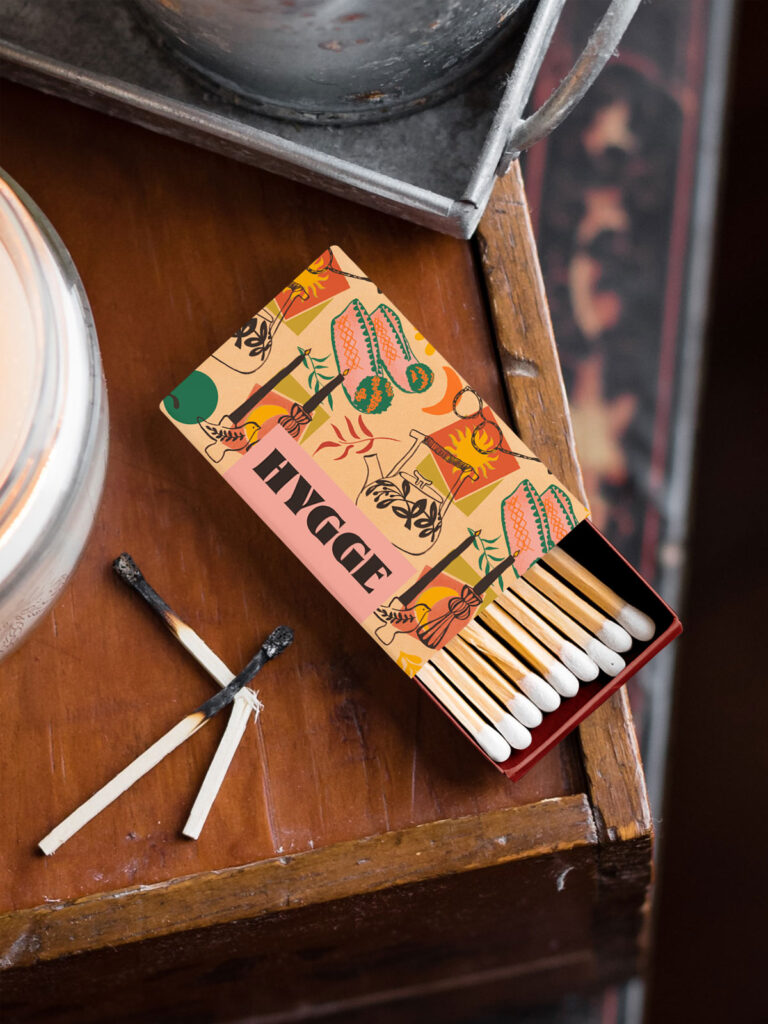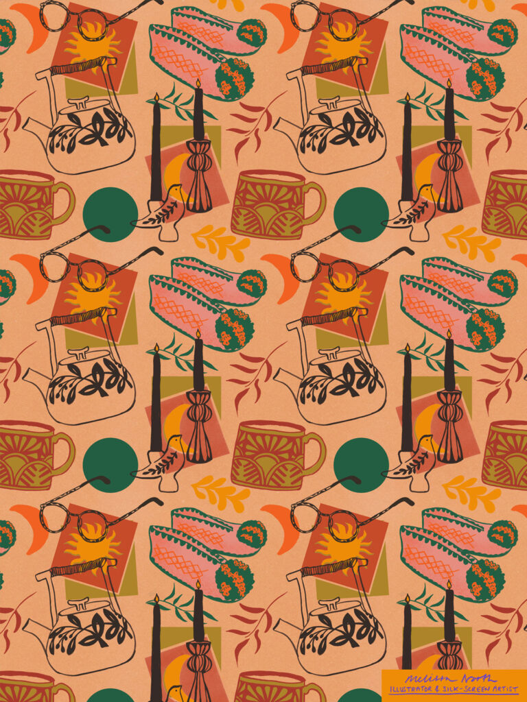 Hygge: In Danish culture, a feeling of cosiness, contentment or well-being. For this illustrated pattern I loved conjouring up all the things that evoke cosiness for me: soft lighting, snuggly slippers, a good book, cute candles and hot drinks out of pretty cups. I illustrated all the elements using brush and ink before applying colour and arranging the pattern digitally.